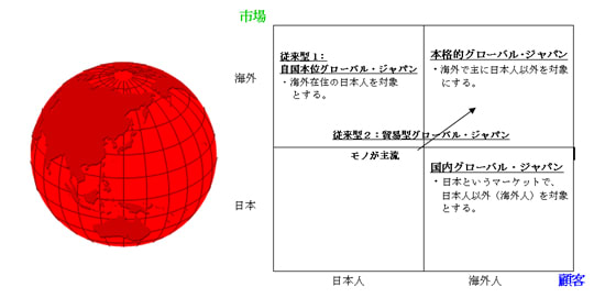 3番目が日本国内に在住あるいは滞在する日本人以外の外国人向けにクール・ジャパンなどを提供する「国内グローバル・ジャパン」がある。